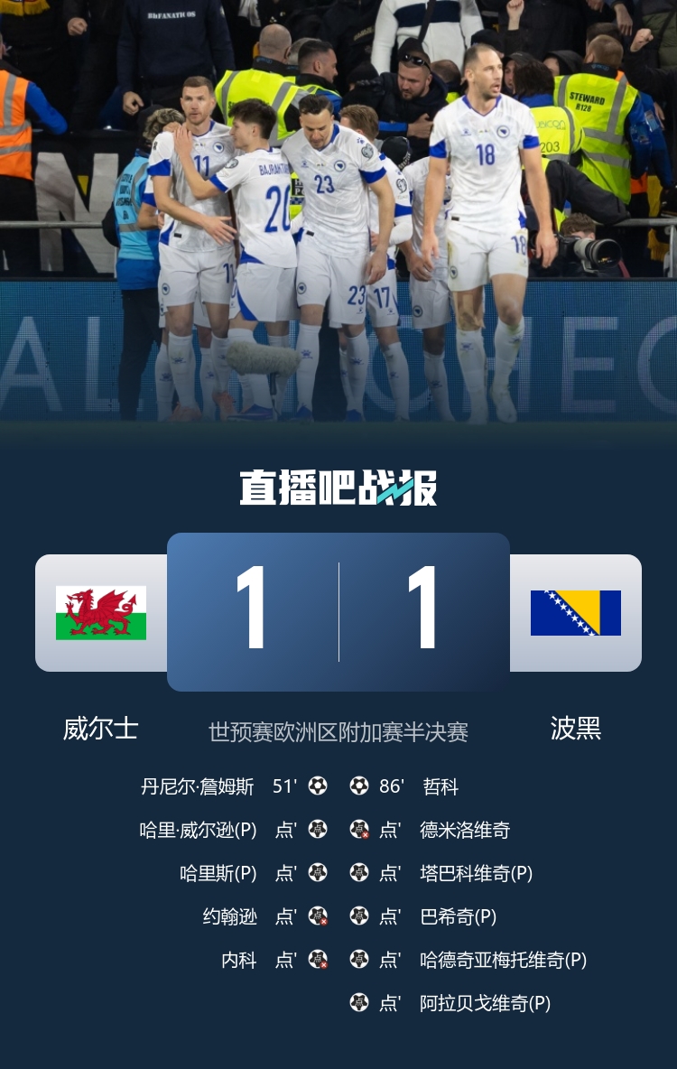 直播吧3月26日讯 北京技术3月27日03:45,世初赛欧洲区附加赛半决赛威尔士迎战波黑的比赛在卡迪夫城球场进行,上半场威尔逊兜命中柱,瓦西里献精彩扑救,下半场丹尼尔·詹姆斯全国波冲突僵局,达尔洛献神扑,哲科头球扳平比分,最终惯例技术放手威尔士1-1波黑。加时两边均无建立,点球大战约翰逊、内科威廉姆斯失点,最终波雀斑球5-3威尔士将战意大利。 比赛要道事件: 第51分钟,威尔士冲突僵局!丹尼尔·詹姆斯前场右路弧顶抢断后突施暗箭凌空抽射全国波破门,威尔士1-0波黑。↓ ↓ 第85分钟,波黑扳平比分!阿拉贝戈维奇左路角球开到禁区哲科高高跃最先球破门,威尔士1-1波黑。↓ ↓ 点球第一轮,德米洛维奇主罚被达尔洛扑出,威尔逊主罚破门。↓ ↓ 点球第二轮,塔巴科维奇主罚球进,雅博(中国)app哈里斯主罚球进。↓ ↓ 点球第三轮,巴希奇主罚破门,约翰逊主罚打飞了。↓ ↓ 点球第四轮,哈德奇亚梅托维奇主罚破门,内科威廉姆斯主罚被扑出。↓ ↓ 点球第五轮,阿拉贝戈维奇主罚破门。↓ 比赛焦点一刹: 第9分钟,波黑右路边线球到门前德米洛维奇背身兜射被达尔洛充公。↓ 第22分钟,布鲁克斯右路直塞到禁区威尔逊一脚兜射打在远端立柱上弹出。↓ 第39分钟,威尔士右路定位球契机,威尔逊告成敲门被瓦西里扑出。↓ 上半场补时2分钟,威尔士0-0波黑。 下半场易边再战,第62分钟,哲科禁区左路头球摆渡到后点德米洛维奇头球被达尔洛骁勇扑出。↓ 下半场补时5分钟,威尔士1-1波黑。 最止境球大战,波黑4比2威尔士,总比分波黑5比3威尔士。 两边首发以及换东谈主信息: 威尔士首发:1-达尔洛、3-内科、4-劳勒、6-罗登、2-杰·达席尔瓦、5-阿姆帕杜、17-乔丹·詹姆斯(54'10-卡伦)、7-布鲁克斯(73'18-哈里斯)、8-哈里·威尔逊、20-丹尼尔·詹姆斯(83'19-托马斯)、11-约翰逊 波黑首发:1-瓦西里、5-科拉希纳茨(61'19-阿拉贝戈维奇)、18-卡蒂奇、4-穆哈雷莫维奇、15-梅米奇(73'17-布尔尼奇)、14-桑吉克(77'23-塔巴科维奇)、20-巴伊拉塔雷维奇、6-塔希罗维奇(61'13-巴希奇)、7-德蒂奇(112'8-吉戈维奇)、10-德米洛维奇、11-哲科(91'16-哈德奇亚梅托维奇)雅博(中国)app 开云体育官方网站首页 |
